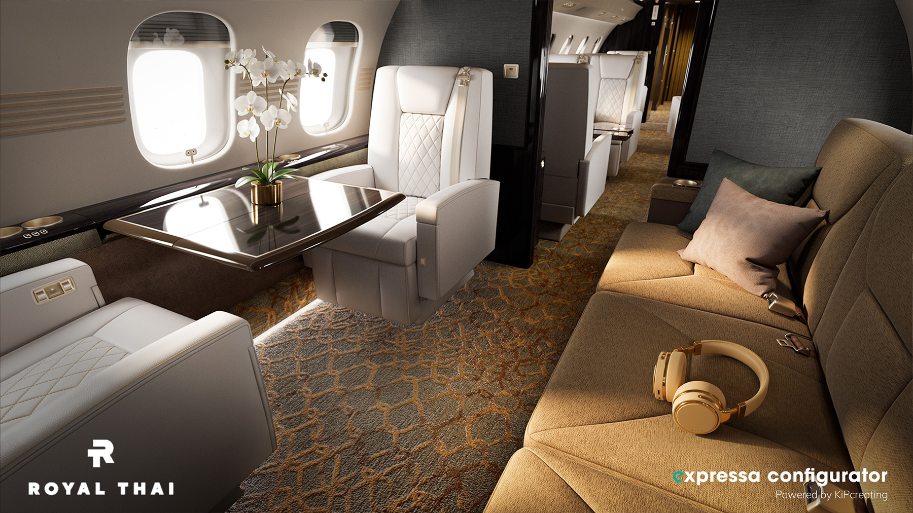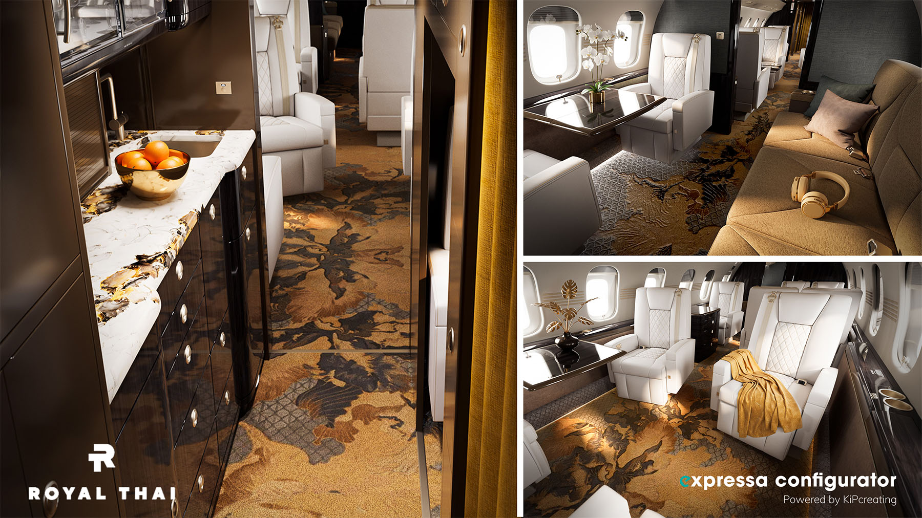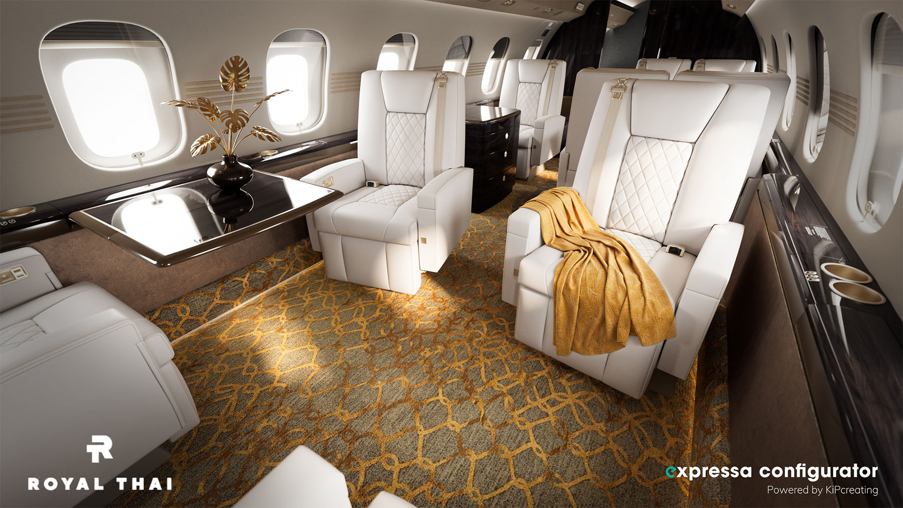 Working closely with Royal Thai, we developed a clean and elegant interior color scheme inspired by their Metallic Collection, using the Expressa Configurator to translate a material-driven concept into a realistic cabin environment. A crisp white base set the stage for golden metallic accents, capturing a refined sense of luxury through subtle contrast and balance.